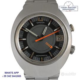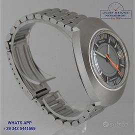 Omega Seamaster Memomatic con data acciaio, anno di produzione 1971, vetro hesalite, quadrante bicolore grigio con data indici e sfere al trizio originale Omega dell’epoca, movimento meccanico a carica automatica, bracciale acciaio con chiusura deployante originale dell’epoca Omega.