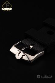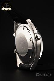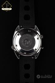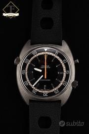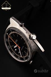 Omega Seamaster Chronostop ref. 145.008 – Anni ’60 – Acciaio – Calibro 865 – Quadrante nero – Cronografo monopulsante Tempus Fugit Bologna propone Omega Seamaster Chronostop ref. 145.008, una delle creazioni più originali e riconoscibili della produzione Omega degli anni ’60, qui proposta in acciaio con caratteristica cassa tonneau, quadrante nero e iconica lancetta cronografica centrale arancione. Un modello dal design fortemente identitario, pensato per offrire una lettura immediata del tempo cronometrato attraverso il pratico sistema cronografico monopulsante. La referenza 145.008 rappresenta una delle interpretazioni più interessanti della filosofia sportiva Omega di quel periodo: linee tese, impostazione tecnica, leggibilità eccellente e una personalità estetica fuori dagli schemi. In questa configurazione, con movimento calibro 865 visibile in foto e fondello interno correttamente punzonato, l’orologio conserva tutto il fascino del Seamaster Chronostop più puro. Caratteristiche principali:Marca: OmegaModello: Seamaster ChronostopReferenza: 145.008Periodo di produzione: Anni ’60Movimento: Meccanico a carica manuale – Calibro Omega 865, 17 rubiniCassa: In acciaio inox, forma tonneau, con pulsante cronografico singolo e corona laterale dedicataQuadrante: Nero con minuteria periferica, scala esterna graduata, indici applicati luminescenti e lancetta cronografica centrale arancioneVetro: PlexiglassCinturino: Cinturino sportivo nero stile racing con fibbia logata OmegaFunzioni: Ore, minuti, cronografo monopulsante a lettura centrale. Tempus Fugit Bologna Via San Vitale 42/A