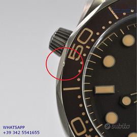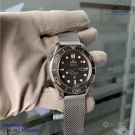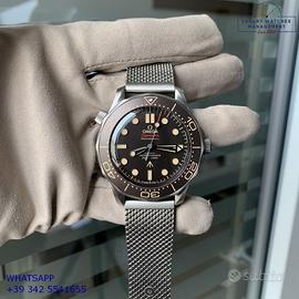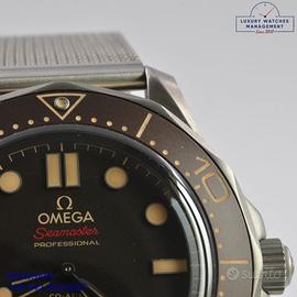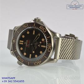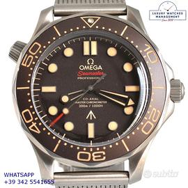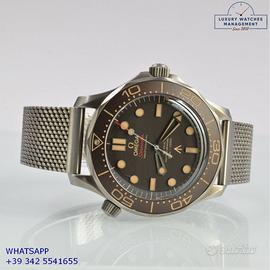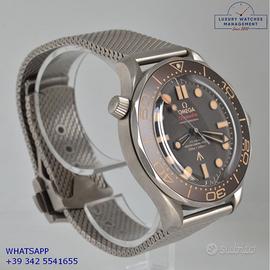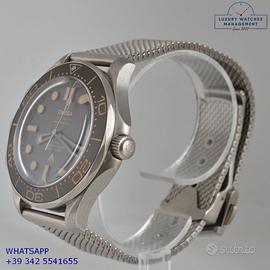 Omega Seamaster Diver 300M 007 James Bond No time to die titanio, anno di produzione 2023, ghiera in titanio unidirezionale inserto alluminio con sala graduata colore marrone tropicale, vetro zaffiro antiriflesso e antigraffio, quadrante tropicale colore marrone con indici e sfere luminescenti, movimento meccanico a carica automatica, bracciale in titanio con chiusura deployante regolabile originale Omega.