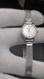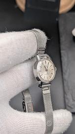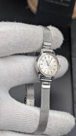 Quadrante argenté con indici applicati, cassa in acciaio e bracciale a maglia Milano molto fine.