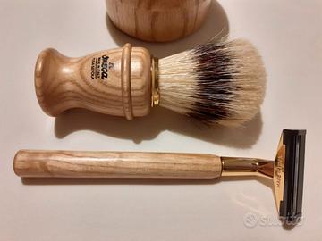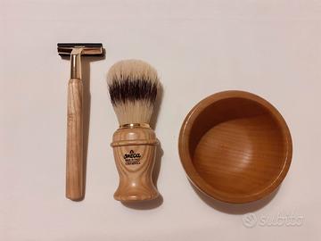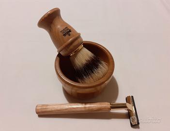 Set da barba OMEGA - rasoio, pennello, ciotola Tutto in legno naturale Made in Italy NUOVO - No scatola