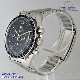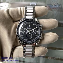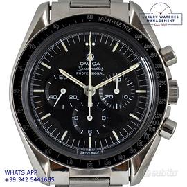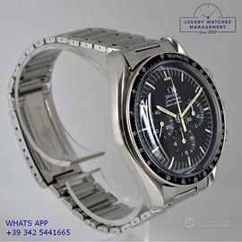 Per conoscere il prezzo e le caratteristiche tecniche dei nostri orologi visita il nostro sito ufficiale: https://lwmitalia.com/it Tutti i nostri orologi vengono verificati e revisionati dal nostro laboratorio specializzato “KeepTime Lab”: https://keeptimelab.com/it/ Omega Speedmaster Professional Moonwatch acciaio, anno di produzione 1970, ghiera acciaio con inserto alluminio colore nero con scala graduata sbagliata 220, vetro plastica hesalite, quadrante opaco colore nero a tre contatori con indici e sfere al trizio, movimento meccanico a carica manuale, raro bracciale acciaio elastico con chiusura deployante originale Omega dell’epoca. Orologio originale Omega in ogni sua parte, revisionato in ottime condizioni, segni di usura assenti o appena visibili, scatola originale Omega dell’epoca, garanzia/dichiarazione di vendita del nostro negozio valida per 12 mesi.