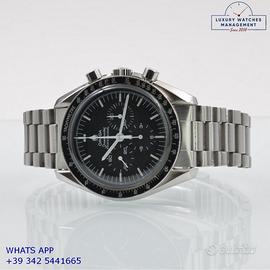 Omega Speedmaster Professional Moonwatch acciaio, anno di produzione 1983, ghiera acciaio con inserto in alluminio colore nero a scala graduata 500, vetro plastica hesalite bombato, quadrante colore nero opaco a tre contatori orizzontali con indici e sfere al trizio, movimento meccanico a carica manuale, bracciale acciaio con chiusura deployante originale Omega.