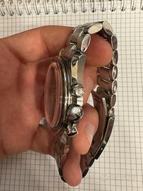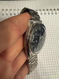 Questo orologio è un cronografo in acciaio dal design sportivo ed elegante, ispirato alla celebre linea Omega Speedmaster di Omega. La cassa in acciaio inox presenta linee classiche e proporzioni equilibrate, con una finitura che alterna superfici lucide e satinate per un aspetto raffinato ma dinamico. Il quadrante nero è pulito e ben strutturato, arricchito da tre contatori cronografici disposti in modo armonioso, che aggiungono profondità e funzionalità. La scala tachimetrica incisa sulla lunetta metallica esterna rafforza il carattere racing dell’orologio, richiamando i modelli pensati per misurare la velocità media. Le lancette principali sottili garantiscono una lettura precisa, mentre spicca la particolare lancetta a freccia del contatore destro, dettaglio originale che dona personalità al quadrante. Gli indici lineari e il minuteria periferica contribuiscono a un look tecnico e ordinato. Sul lato destro della cassa troviamo i pulsanti cronografici e la corona centrale, perfettamente integrati nel profilo dell’orologio. Il bracciale in acciaio a tre maglie completa l’insieme con comfort, solidità e uno stile versatile. Nel complesso è un orologio dal fascino intramontabile, ideale per chi cerca un segnatempo sportivo con eleganza discreta, adatto sia all’uso quotidiano che a contesti più ricercati.