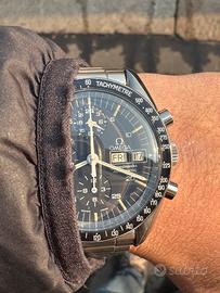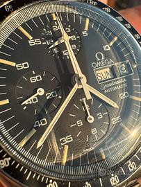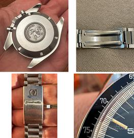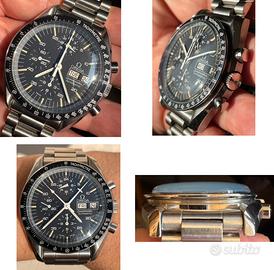 Rarissimo e perfettamente conservato, Omega Speedmaster, detto “Holy Grail”, ref. ST376.0822 , del 1987. Edizione limitata, meno di 800 esemplari sono noti oggi nella configurazione corretta, come questo, in condizioni eccellenti. Con la sua lunetta DNN “B2”. Cassa e lunetta non sono mai state lucidate. Il quadrante, tipo 1, realizzato da Singer e con contatori a cerchi concentrici, è perfetto 10/10. Lancette originali e coeve. Il vetro, bluastro e senza logo Omega, è originale e di origine ed è realizzato in un polimero acrilico chiamato “Hesalite” e una delle sue peculiarità distintive è che include, fissata sul bordo interno, una scala dei minuti in metallo. Indici e lancette intatti mostrano una bellissima patina. Osservando il fondello, si nota che tracce del sigillo rosso sono ancora presenti dopo oltre 35 anni. Movimento automatico, calibro 1045, basato sul Lemania 5100, con indicazione giorno/data, indicatore 24 ore e lancetta centrale dei minuti del cronografo a forma di "aereo". Il primo movimento automatico alloggiato in uno Speedmaster! L'installazione di questo movimento rappresenta una pietra miliare nella storia dello Speedmaster, colmando il divario tra la tradizione della carica manuale e le esigenze dell'orologeria moderna. Il Calibro 1045 è un calibro affidabile e robusto e la regolazione è pressochè immediata, grazie al doppio scatto rapido di giorno e data. Numero di movimento n. 48.231.xxx. Il calibro marcia perfettamente. L'orologio è dotato del ricercatissimo bracciale 1450, finali corretti 809. Dal primo proprietario. Orologio originale e coevo al 100%. No perditempo, sognatori ed alla larga truffatori. Preferita consegna a mano. Possibilità di permuta con Rolex di mio gradimento. Eventuale spedizione, previo accredito bonifico, con corriere blindato.