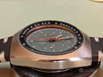 spettacolare cassa acciaio originale da 42mm di tipica forma space age icona di un periodo di esplorazioni spaziali corona originale logata splendido quadrante originale nero matt virato al grigio con particolare minuteria a scacchi rossi ormai amaranto in stile racing sfere laccate ore e minuti avorio con contatori ocra arancio e sfera secondi centrale arancio vetro zaffiro originale con scala tachigrafica serigrafata all'interno calibro meccanico a carica manuale con funzione cronografica omega 861 (su base lenania 1873) perfettamente marciante controllato presso i nostri laboratori, orologio originale e coevo in ogni sua componente