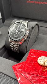 - Modello: Omega Speedmaster Moonwatch Professional - Referenza: 310.30.42.50.01.001 - Anno: 2023 con garanzia Omega ufficiale attiva e datata - Movimento: Calibro 3861 a carica manuale, - Cassa: Acciaio 42mm, spessore 13.2mm, WR 50m. Anse 20mm. Finitura lucida e satinata - Lunetta: Nera in alluminio anodizzato con scala tachimetrica. Dot over 90 e punto diagonale al 70 come i vintage - Vetro: Hesalite bombato con logo Omega inciso al centro. Stessa scelta della NASA per le missioni Apollo: in caso di rottura non genera schegge - Quadrante: Nero "step dial" con contatori incassati. Indici applicati, lancette a bastone, crono con punta a freccia. Scritta "Professional" staccata da Speedmaster - Fondello: Acciaio pieno con incisione del cavalluccio marino e scritte "FLIGHT-QUALIFIED BY NASA" e "THE FIRST WATCH WORN ON THE MOON" - Corredo: Full set completo. Doppia scatola Moonwatch, garanzia internazionale + pictogram card 2023, manuale Questo è il Moonwatch "base" attuale: carica manuale, Hesalite, fondello chiuso. È la versione più fedele allo Speedmaster che è andato sulla Luna nel 1969. Orologio in garanzia omega fino al 2028 Vendita fra privati Do e pretendo la massima serietà Valuto permute anche di valore superiore con: Rolex - Omega - Tudor - Panerai - Breguet - Zenith - Iwc - Ecc..