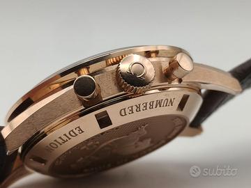Omega Modello (Orologio) Speedmaster Professional Moonwatch Numero di referenza 311.63.40.30.02.001 Carica Manuale Materiale della cassa Oro rosa Anno di produzione 2018 Condizione Usato (Ottimo) Corredo Con scatola originale e documenti originali Genere Orologio da uomo/Unisex Luogo italia-viareggio Calibro Carica Manuale Riserva di carica 48 h Numero delle pietre 18 Cassa Materiale della cassa Oro rosa Diametro 39.7 mm Impermeabile 5 ATM Materiale lunetta Ceramica Vetro Vetro zaffiro Quadrante Argento Numeri sul quadrante Senza numeri Cinturino Colore cinturino Marrone Chiusura Chiusura ad ardiglione Materiale chiusura Oro rosa Funzioni Cronografo, Tachimetro Altro Ulteriori dettagli Piccoli secondi Sicurezza dei prodotti Visualizza le informazioni Descrizione Omega 311.63.40.30.02.001 Speedmaster Moonwatch Sedna Numbered Edition, 31163403002001, cassa in oro rosa massiccio 18 carati su un cinturino in pelle con chiusura a T in oro rosa 18 carati, calibro automatico Omega 1861, riserva di carica di 48 ore, quadrante argentato con 3 registri, lancette e indici luminescenti, vetro zaffiro, impermeabile fino a 50 metri, diametro: 39,7 mm, spessore: 14,9 mm, viene fornito con un'ulteriore fibbia deployante in oro rosa, come nuovo con scatola e documenti (miglior prezzo online) -MANUEL OROLOGI-