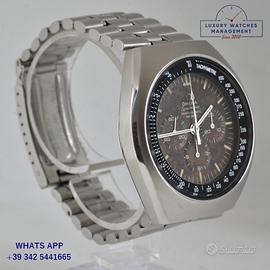 Omega Speedmaster Professional Mark II cronografo acciaio, anno di produzione 1972, vetro minerale piatto, quadrante tropicale colore marrone cioccolato a tre contatori con indici e sfere al trizio, movimento meccanico a carica manuale, bracciale acciaio con chiusura deployante originale Omega.