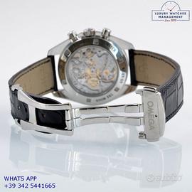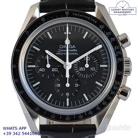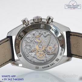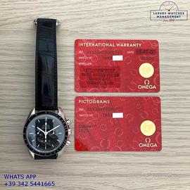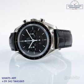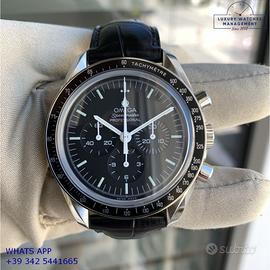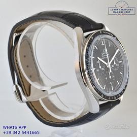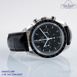 Omega Speedmaster Professional Moonwatch acciaio, anno di produzione 2020, ghiera in acciaio con inserto alluminio colore nero a scala tachimetrica 500, vetro zaffiro antiriflesso, quadrante colore nero opaco con indici e sfere al LumiNova, movimento meccanico a carica manuale, cinturino in pelle di alligatore colore nero con chiusura deployante in acciaio originale Omega, più cinturino modello NATO e un altro in tessuto con chiusura a strappo in velcro utilizzato per la missione lunare.