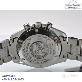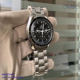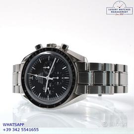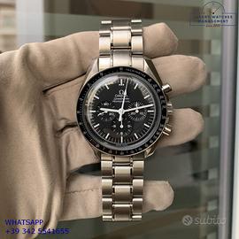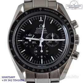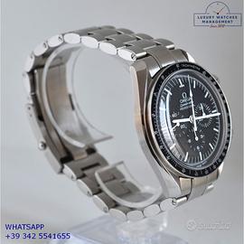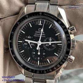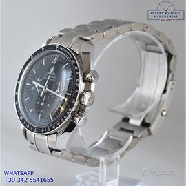 Omega Speedmaster Professional Moonwatch acciaio, anno di produzione 2019, ghiera acciaio con inserto in alluminio colore nero a scala tachimetrica graduata 500, vetro plastica Hesalite originale Omega, quadrante colore nero opaco a tre contatori orizzontali, indici e sfere al Super-LumiNova, movimento meccanico a carica manuale, bracciale acciaio con chiusura deployante originale Omega.