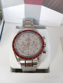 Cassa in acciaio inossidabile lucido e satinato, diametro della cassa 42 mm, spessore della cassa 14 mm, lunetta in acciaio inossidabile con intarsio rosso e scala tachimetrica, bracciale in acciaio inossidabile lucido e satinato con chiusura di sicurezza, quadrante color argento con indici luminescenti, lancette luminescenti, movimento a carica manuale, calibro Omega 1861, 21.600 a/h, riserva di carica circa 48 ore, cronografo, piccoli secondi a ore 9, vetro zaffiro, fondello in acciaio inossidabile avvitato e inciso, impermeabile fino a 5 bar, edizione limitata a 2020 esemplari. CONSEGNA A MANO NO SèEDIZIONE