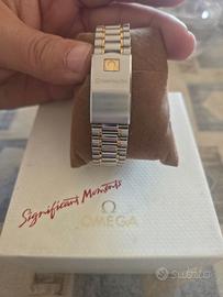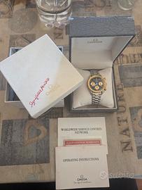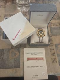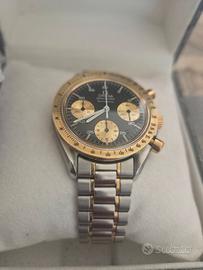 RARISSIMA PRIMA SERIE – FULL SET COLLEZIONISTICO Per il vero appassionato che cerca l'eleganza dell'oro unita alla sportività dello Speedmaster. Si vende un esemplare della referenza 175.0033 in condizioni strepitose, caratterizzato dal rarissimo seriale 5.111.XXX, che lo identifica come uno dei primissimi esemplari prodotti al lancio della linea Reduced. DETTAGLI TECNICI: Referenza: 175.00.33 Movimento: 1140 Automatico, calibro Omega su base ETA + Modulo Dubois-Dépraz. Produzione circa 1988 1989 - primissimi della serie Reduced. Cassa: 39mm in acciaio con lunetta, corona e pulsanti cronografici in Oro Giallo 18k. Quadrante: Configurazione classica con indici al trizio che presentano una magnifica virata vintage. Vetro: Esalite originale con logo Ω al centro. IL CORREDO (FULL SET): Trovare un acciaio-oro di quegli anni con il set completo è un’impresa per pochi. L'orologio è accompagnato da: Controscatola originale. Scatola originale. Garanzia Card originale dell'epoca. STATO DI CONSERVAZIONE: Orologio conservato con estrema cura. Le parti in oro 18k mantengono la loro lucentezza originaria, i tasti e la corona sono perfettamente integri e il bracciale acciaio/oro coevo mostra una tenuta eccellente. NOTA PER IL COLLEZIONISTA: Il seriale 51 milioni non è solo un numero, ma la prova che si tratta di una "First Series". In un mercato che premia sempre più le prime produzioni, questo Speedmaster rappresenta un'opportunità di investimento e godimento estetico superiore alla media. CONDIZIONI UNICHE. UN PEZZO DI STORIA OMEGA.