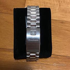 cassa in acciaio, fondello a pressione con logo Speedmaster, tasti a pompa, corona marcata, ghiera con inserto nero e scala tachimetrica, quadrante nero, grafica bianca, indici e numeri arabi in bianco, tre contatori, movimento a carica automatica cal ETA 2890A2, bracciale in acciaio a maglie piene, lungh. interno cm 20 circa, chiusura a scatoletta marcata Omega, vetro plastica. Diam. mm 38.