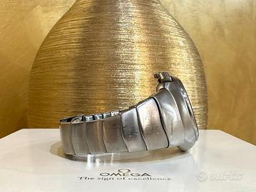 Movimento: Omega Cal. 1250 f 300 Hz a diapason, 12 rubini, cronografo modulare Dubois-Dépras, datario a scatto rapido; marcia silenziosa e lancetta centrale dei secondi che scorre “fluidamente”.