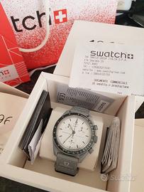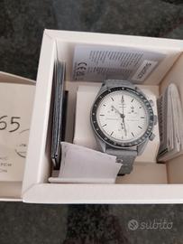 Questo cronografo non limitato è dotato di cassa, corona e pulsanti in Bioceramic grigi in Bioceramic e di un cinturino in VELCRO® sempre grigio con impunture grigio chiaro a contrasto e passante in Bioceramic. Ha un quadrante bianco e una lunetta nera in Bioceramic con scala tachimetrica bianca. Questo segnatempo è dotato di due contatori unici a ore 10 e a ore 2. Il primo indica il numero 19 (normalmente 60) in alto, mentre il secondo mostra il numero 65 (normalmente 10), con riferimento all'anno 1965. Questi contatori sono stati calibrati per un totale di 19 ore (contatore a ore 10) e 65 minuti (contatore a ore 2), rendendo la lettura un po' diversa da quella tipica dei cronografi. I numeri 19, 65 e 60 (sul contatore a ore 6) si illuminano di blu alla luce ultravioletta, in omaggio all'OMEGA Speedmaster e all’idoneità al volo ottenuta dalla NASA sessant’anni anni fa, nel 1965. Sul copribatteria si trova un'immagine della Luna. Tutti i quadranti della collezione recano il marchio OMEGA X Swatch, l'iconico logo Speedmaster e il logo MoonSwatch. La forma bombata del vetro biosourced, la "S" incisa al centro che richiama il logo Swatch, il raffinato e sofisticato motivo circolare sull'anello esterno del quadrante e sui quadranti secondari incassati, la struttura angolare e armoniosa delle anse e, naturalmente, l'esclusiva sensazione al tocco del Bioceramic sono comuni a tutti i modelli. Gli indici, le lancette delle ore e dei minuti e la punta della lancetta dei secondi cronografici sono rivestiti di Super-LumiNova® di grado A per una perfetta illuminazione al buio (emissione verde).