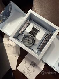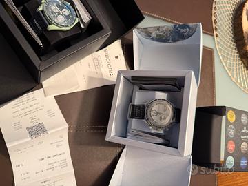 Omega Swatch quí due modelli Mission to Earthphase e Mission on Earth Originali come da scontrino allegato e visibile con annessa garanzia Swatch Nel 2022, OMEGA e Swatch hanno creato un'innovativa rivisitazione in chiave Swatch del leggendario Speedmaster Moonwatch di OMEGA, il primo orologio a essere andato sulla Luna. Questa partnership inaspettata, provocatoria e visionaria ha dato vita a una collezione di cronografi che ha conquistato il pubblico di tutto il mondo con il suo fascino celestiale. Realizzati con il nostro innovativo materiale Bioceramic in colori quasi mai visti, questi orologi presentano tutte le caratteristiche dello Speedmaster Moonwatch di OMEGA, che grazie a questa collaborazione unica diventa accessibile ai fan di tutto il mondo.