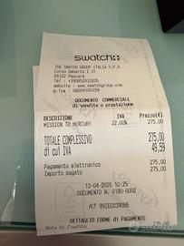 Vendo per doppio regalo moonswatch mission to mercury con scontrino datato 13/04/2026 preso nello store di Pescara. Modello acquistabile solo in store e non online. Prezzo di listino 275€