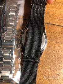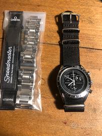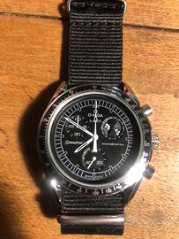 Moonswatch Snoopy incassato su cassa acciaio, cronografo funzionante. Viene venduto con i tre bracciali in foto, acciaio, nato in tessuto nero e strap moonswatch. Se interessati posso inviare il video tramite whatsapp, con la chat di Subito non é possibile. Visibile a Roma o posso spedire