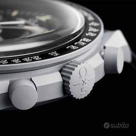 Vendo splendido orologio Omega X Swatch MoonSwatch, modello "Mission to the Moon" nuovo, mai indossato, è stata tolta la pellicola dal quadrante solamente per fargli una foto, dopo di che gli è stata immediatamente riapplicata. L'orologio è un omaggio all'iconico Speedmaster Moonwatch di OMEGA, reinterpretandolo in chiave moderna grazie alla collaborazione tra Swatch e Omega. L'orologio presenta le caratteristiche distintive comuni a tutti i modelli: il vetro biosourced con la "S” incisa e integrata al centro, il motivo circolare raffinato ed elegante sull'anello esterno del quadrante e i quadranti secondari incassati, la struttura angolare e armoniosa delle anse, l'iconico dettaglio del "punto sopra il 90" sulla scala tachimetrica e, naturalmente, la sensazione unica al tatto della Bioceramica, mettono in risalto la passione per i dettagli, rendendolo un modello iconico e versatile, ideale per chi cerca un cronografo dal forte carattere estetico e dal design riconoscibile, perfetto per ogni occasione, un'opportunità unica per gli appassionati di orologi e collezionisti! Caratteristiche principali: • Diametro cassa: 42 mm • Spessore: 13,25 mm • Materiale cassa: Bioceramic grigio chiaro • Quadrante: Nero con contatori cronografici tono su tono • Ore, minuti, secondi ed indici del quadrante realizzati in Super-LumiNova® • Lunetta nera tachimetrica • Movimento: Quarzo cronografo preciso e affidabile • Cinturino: VELCRO® nero regolabile • Impermeabilità: 3 Bar (30 metri) • Corredo: Full Set (scatola, scontrino, garanzia ufficiale e libretto) • Condizioni: orologio nuovissimo mai utilizzato, con la sua pellicola sul vetro Per ulteriori informazioni potete contattarmi via WhatsApp al 338.7698077 Possibile la consegna a mano a Milano. Il prezzo non è trattabile, in quanto, dato che all'epoca era estremamente difficile da reperibile, per poterlo avere, ho dovuto pagarlo 320 euro, e se lo devo vendere a meno, preferisco tenermelo. Astenersi offerte inferiori. Grazie