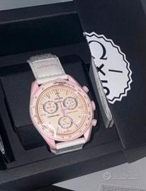L’orologio presenta una raffinata cassa in bioceramica rosa, quadrante chiaro con contatori cronografici coordinati e cinturino in VELCRO® brandizzato Omega x Swatch. Design elegante e sportivo allo stesso tempo, ispirato al leggendario Omega Speedmaster.