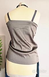 Top con spalline in seta del marchio Dorotheel Schumacher. Scollo asimmetrico, drappeggio laterale strategico che valorizza la silhouette e spalline in gros-grain con fibbie metalliche reqolabili. Colore taupe satinato - una tonalità neutra ultra-lussuosa con riflessi metallici. Taglia XS (veste bene anche una S grazie al taglio fluido). In condizioni eccellenti.
