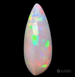 Vendo bellissimo Opale naturale certificato IGI, caratterizzato da una play-of-color luminosa e ben distribuita. La gemma mostra una base chiara con riflessi intensi e multicolore, in particolare verde, arancio e violetto, che emergono con movimento e profondità. Taglio cabochon a pera, cupola ben proporzionata e ottima resa visiva complessiva. Dettagli della gemma (da report IGI): • Specie: Opale naturale • Varietà: Opale prezioso (Precious Opal) • Taglio: Cabochon a pera • Peso: 12,37 carati • Misure: 22,68 × 15,20 × 7,95 mm • Colore e trasparenza: Light Orange, colori dominanti Violet, Green, Orange – Trasparente • Caratteristiche: Inclusioni naturali (pattern) • Fenomeno ottico: Play of color • Trattamento: Non indicato sul report IGI • Certificazione: IGI – International Gemological Institute • Numero report: 756571531 • Data: 26 gennaio 2026 Informazioni aggiuntive: • Opale naturale certificato IGI • Play-of-color brillante e dinamica • Taglio equilibrato, ideale per gioielleria di pregio o collezione • La pietra in foto è esattamente quella in vendita Spedizione e dogana: • Spedizione internazionale • Assicurata e tracciabile • Imballaggio professionale • Certificato IGI incluso • Eventuali dazi doganali, IVA o tasse di importazione sono a carico dell’acquirente Nota: Le fotografie sono reali e scattate con illuminazione professionale. Eventuali lievi variazioni di colore possono dipendere dalle condizioni di luce o dal display utilizzato.