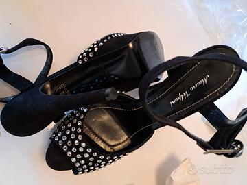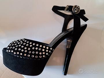 Sandali donna camoscio, tacco alto 15 cm con plateau 3,5 cm. Vera pelle, cinturino con teschio e strass sulla fascia. Calza piede sottile 38,5-39. Mauro Volponi di Forte dei Marmi.