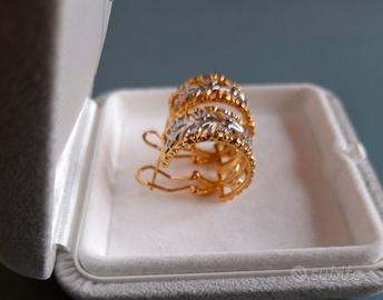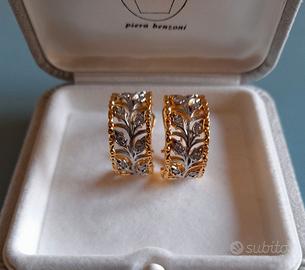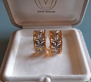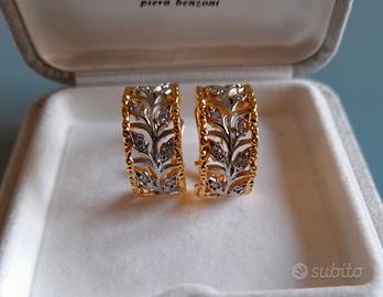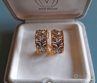 Eleganti orecchini di bigiotteria contemporanea a boccola traforati in rame dorato bicolore oro e argento con motivo a foglie e zirconi sintetici incastonati nello stile di Buccellati Diametro: 16,4 mm Larghezza: 9,4 mm Se vuoi creare una demi parure, ho in vendita anche l’anello con lo stesso motivo. Nuovi Vengono forniti in una scatola regalo boccole orecchini a cerchio