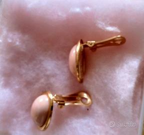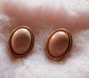 Orecchini vintage per lobi non forati con fermo a clip. Presentano una perla ovale a cabochon tipo corallo chiaro. Condizioni ottime.