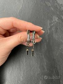 Eleganti anelle / orecchini a cerchio di bigiotteria dal design scintillante: in metallo argentato, sono interamente decorati da strass neri. Chiusura con levetta a molla. Indossati sono una volta, nel tempo si sono un po' ossidati sulla parte in metallo, ma sono comunque belli. Prezzo trattabile. Disponibili altre informazioni e foto su richiesta. *Articolo presente su altri siti*