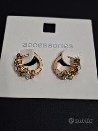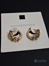 Vendo bellissimi orecchini a cerchio (hoop) color oro, arricchiti da un pavé di cristalli multicolore (verde, bianco/trasparente e ambra) con taglio a baguette. Sono un accessorio luminoso ed elegante, perfetto per dare un tocco di colore sia a look casual che formali.
