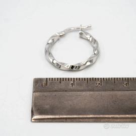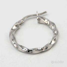 Orecchini in oro bianco 18 kt grammi 1,6 a cerchio . La lavorazione è a torciò e il diametro è di cm. 2. Prodotto made in Italy munito di marchio di fabbrica come da legge e completo di confezione e certificato di qualità rilasciato dalla Gioielleria.