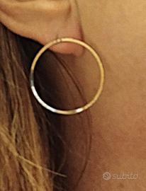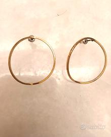 Orecchini a cerchio dal design particolare, non il classico modello che attraversa perpendicolarmente il foro dell’orecchio: rimane “appoggiato” al lobo creando un effetto sospeso, come visibile nella foto.