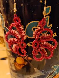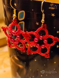 orecchini realizzati con la tecnica del chiacchierino a navetta. i pezzi più piccoli costano 8 euro. la coppia di orecchini bianca viene affiancata dal ciondolo coordinato. Il tris viene 15 euro. Solo il ciondolo 8 euro e solo gli orecchini 10 euro