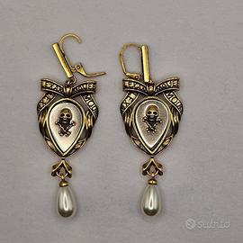 Orecchini Alexander McQueen Skull and Fairy Pearl.In metallo anallergico,senza nichel.Chiusura a monachella con zirconi neri incastonati,da cui pende un cuore,con in alto un fiocco,al cui interno su fondo metallico e' posto un teschio con le ossa.E Perla pendente bianca.