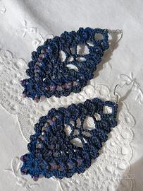orecchini realizzati a mano con l'uncinetto e con filato di colore blu, arricchiti con perline iridescenti che gli donano un tocco di eleganza.