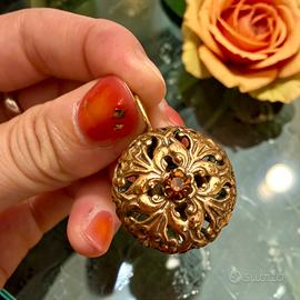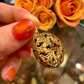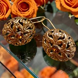 C’è qualcosa in questi orecchini che sembra appartenere a un tempo in cui anche i dettagli avevano un peso diverso: siamo nel secondo Dopoguerra, c’è tanta voglia di bellezza e di normalità. Di poter tornare a pensare a sé. La superficie si apre come un intreccio di volute, quasi un fregio in miniatura, dove ogni curva accompagna lo sguardo verso il centro: un vetro sfaccettato luminoso, color ambra, che cattura la luce con riflessi caldi, profondi. Non sono gioielli preziosi nel senso classico - parliamo di bigiotteria molto ben fatta - eppure hanno una presenza che si fa notare. Sono indiscutibilmente romantici. Indossati, non risultano mai rigidi: hanno qualcosa di morbido, quasi narrativo, come se raccontassero una storia senza bisogno di parole - e sembrano moooolto più antichi di quanto in realtà siano. Una presenza stupenda. La doratura è attenuata sulle chiusure, segno del tempo, mentre il fronte conserva ancora tutta la sua forza espressiva. Perfetti per chi ama i dettagli che hanno sapore.