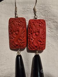 Orecchini in Lacca rossa e onice nero, gancio in argento.