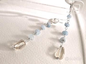 Eleganti orecchini a rosario in argento 925 e pietre naturali: quarzo lemon e acquamarina intagliata a mano.