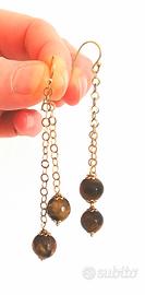 Bellissimi, luminosi orecchini con sfere faccettate in Quarzo Occhio di Tigre montate in Argento 925 placcato Oro, doppia catenella, lunghezza 6,5 cm esclusa la "monachella", nuovi, indossati solo per fare la fotografia. Su richiesta, è possibile sostituire la "monachella" con una "farfallina" e, se lo si desidera, accorciare le catenelle.