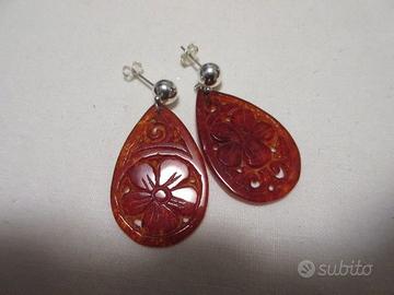 Orecchini con montatura in argento. Pendenti piastre in corniola a forma di goccia. Piastre incise con decoro floreale