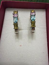 Bellissimi orecchini a cerchio impreziositi da pietre multicolor taglio rettangolare, montate su base color argento. Le tonalità pastello (azzurro, giallo, rosa) li rendono super luminosi ed eleganti, perfetti sia per il giorno che per la sera.