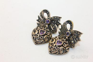 Questi affascinanti orecchini incarnano l'eleganza e il glamour distintivi dell'epoca Art Déco. Realizzati in argento sterling 925, presentano un design squisito che combina la brillantezza scintillante della marcasite con la regale tonalità viola delle ametiste. Il design è caratterizzato da un elegante motivo a fiocco nella parte superiore, interamente tempestato di marcasite che cattura la luce ad ogni movimento. Al centro di ogni fiocco è incastonata una piccola ametista rotonda, che aggiunge un sottile tocco di colore. Sospesi delicatamente sotto i fiocchi, pendono charm a forma di cuore. Questi cuori sono impreziositi da elaborati trafori e volute, tipici dell'estetica Art Déco, che conferiscono leggerezza e complessità al design. Al centro di ogni cuore, un'ametista a taglio cuore più grande funge da punto focale, irradiando una ricca luce viola. Con una dimensione di 31 x 20 mm, questi orecchini hanno una presenza notevole pur mantenendo una grazia raffinata.