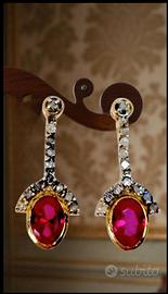 Orecchini Art Déco in oro giallo 9 kt e argento 925 con due rubini ovali (totale 1,88 ct) e 26 diamanti taglio antico europeo (totale 0,25 ct), peso totale 2,12 g, nessuna perizia di laboratorio
