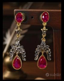 Orecchini in stile Art Déco antico, oro giallo 9 kt e argento, con quattro rubini a goccia (totale 3,60 ct) e trentaquattro diamanti taglio antico (totale 0,32 ct) circostanti; larghezza 3,46 cm, peso totale 3,65 g, fatti a mano, pietre idrotermali colorate e diamanti naturali testati, nessuna perizia di laboratorio.