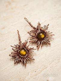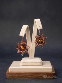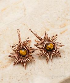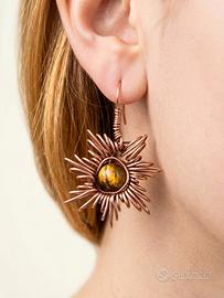 Vendo splendidi orecchini pendenti realizzati interamente a mano con la tecnica del wire wrapping. ☀️ ✨ Filo metallico Rame intrecciato a mano e occhio di tigre. ✨La lavorazione del filo crea un bellissimo motivo a raggiera a forma di sole/girasole che incornicia la pietra centrale. ✨ Boho chic, etnico, alternativo. 🌼☀️Occhio di tigre: In cristalloterapia, l'Occhio di Tigre è conosciuta come la pietra del coraggio e della fiducia in se stessi. È un cristallo potente che unisce l'energia della Terra ai riflessi caldi del Sole, regalando a chi lo indossa un forte senso di stabilità e radicamento. Fin dall'antichità viene considerato un vero e proprio talismano protettivo, capace di allontanare le influenze negative e di donare chiarezza mentale nei momenti di confusione. Essendo collegato al chakra del plesso solare, l'Occhio di Tigre stimola la forza di volontà, aiutando a superare le insicurezze per affrontare la vita con la determinazione tipica della tigre. Indossare questi orecchini non è solo una bellissima scelta di stile, ma anche un modo per portare sempre con sé un concentrato di energia positiva e vitalità. 🍃Perfetti per chi ama i gioielli unici e non convenzionali, con un anima naturale. Leggeri e comodi da portare tutto il giorno. 💌 Disponibile per spedizioni rapide e pacchetti ben curati. 🎁 Perfetti anche come regalo Per qualsiasi informazione o foto aggiuntiva, scrivimi pure in chat!