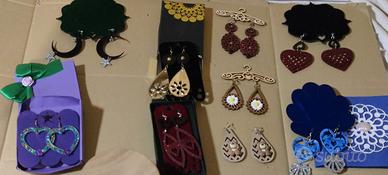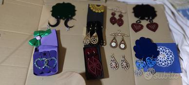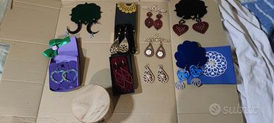 vendo 9 coppie di orecchini estivi artigianali in legno e plastica con un portagioie artigianale in legno
