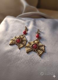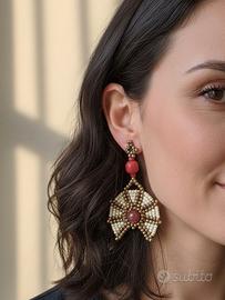 Questi raffinati orecchini etnici incarnano perfettamente lo stile boho-chic, fondendo qualità top Premium e fascino naturale. Un pezzo meticolosamente tessuto attraverso la complessa tecnica del bead weaving, che intreccia lucenti Rocailles Miyuki in una delicata tonalità giallo crema per creare una struttura geometrica armoniosa e leggera. Al centro della composizione spicca la vibrante energia dell'agata rossa, incastonata tra gemme naturali di corallo Bamboo rosso che donano profondità cromatica e un carattere autentico. La montatura è completata da una pratica chiusura a perno con farfallina in acciaio ottonato, che garantisce comfort e una perfetta lucentezza vintage.