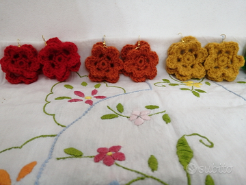 Orecchini lavorati all'uncinetto con filato acrilico nei colori dell'arcobaleno. Fiore diametro 6cm, doppio strato di petali, collegato per mezzo di un anellino alla monachella ad amo, oro o argento. Il prezzo si riferisce ad un paio, ma posso fare un piccolo sconto a chi acquista più di un paio, Grazie per aver visitato questa mia inserzione.